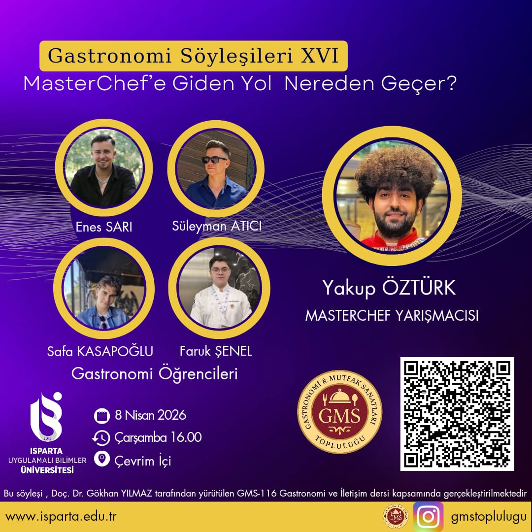 Gastronomi ve Mutfak Sanatları Bölümü tarafından düzenlenen Gastronomi Söyleşileri serisinin on altıncısı, gastronomi alanında kariyer hedefleyen öğrenciler için ilham verici bir içerikle gerçekleştirilecektir. Etkinlikte, televizyon gastronomisi, yarışma dinamikleri ve profesyonel mutfak deneyimi arasındaki ilişki ele alınarak, MasterChef sürecine giden yol çok yönlü bir bakış açısıyla değerlendirilecektir.