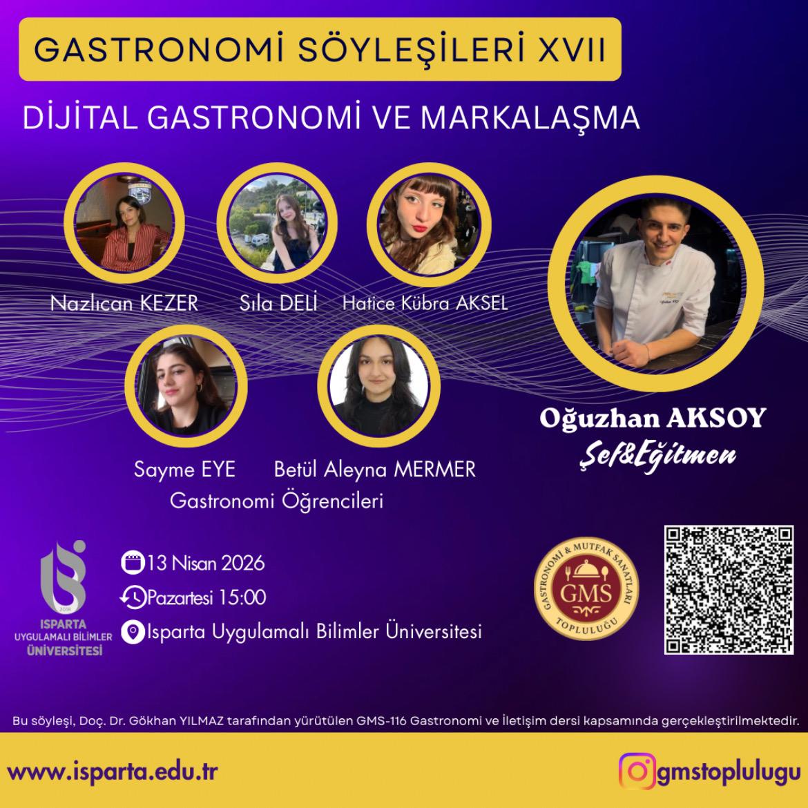 Şef & Eğitmen Oğuzhan Aksoy’un konuk olacağı söyleşide; dijital görünürlük, içerik üretimi, hedef kitle yönetimi ve gastronomide sürdürülebilir marka inşası gibi konular, hem sektörel deneyimler hem de öğrencilerin katkılarıyla tartışılacaktır.