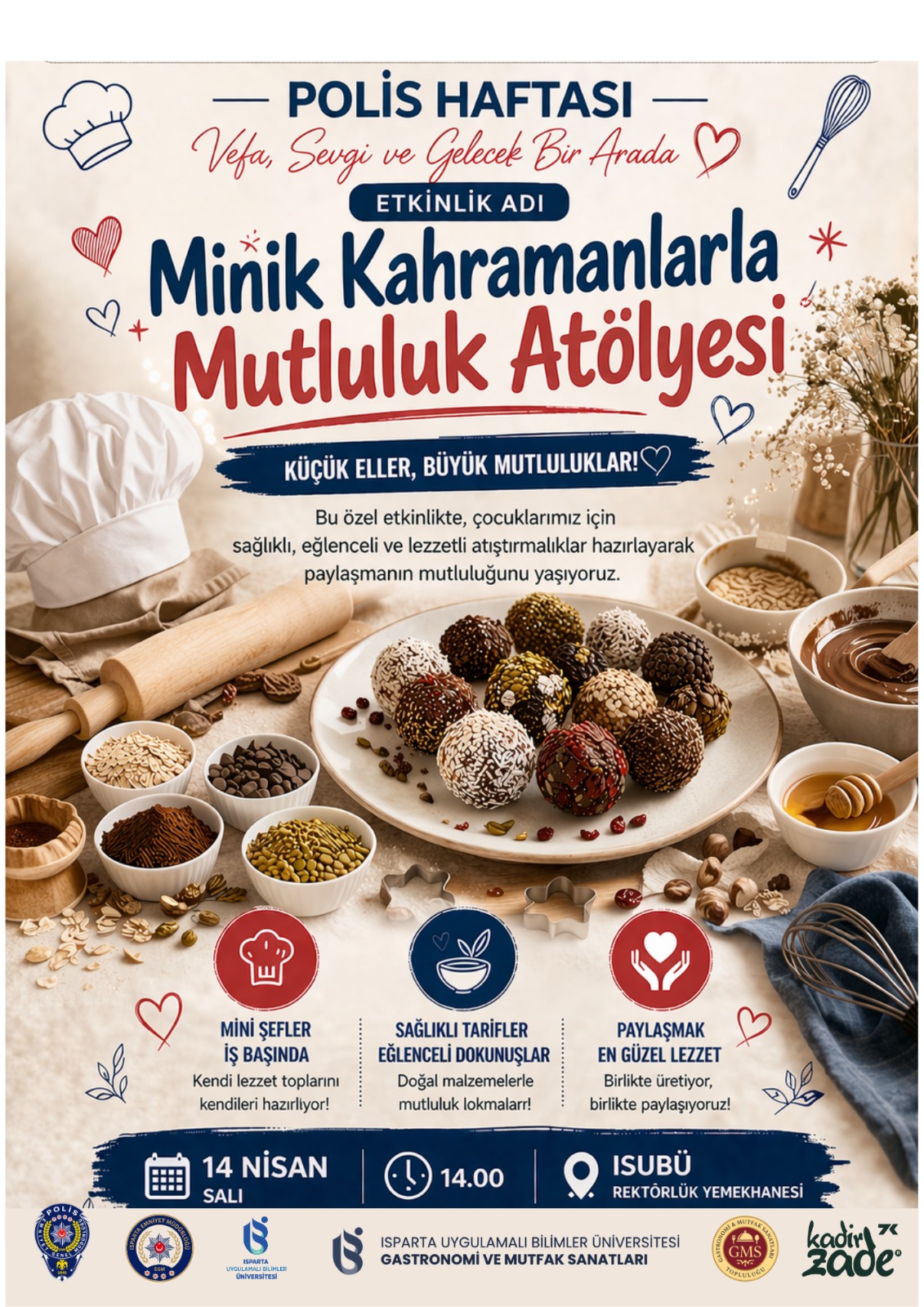 ISUBÜ Gastronomi ve Mutfak Sanatları Bölümü ev sahipliğinde; Isparta Emniyet Müdürlüğü, Gastronomi ve Mutfak Sanatları Topluluğu ve Kadirzade Gıda iş birliğiyle gerçekleştirilecek bu anlamlı etkinliğe katkı sunan tüm paydaş kurum ve kuruluşlara teşekkür ederiz.
