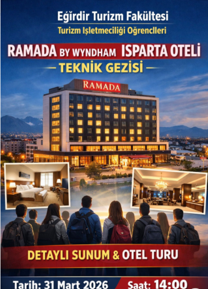 Turizm Fakültesi Turizm İşletmeciliği öğrencileri, turizm bilgilerini pekiştirmek ve turizm sektörünü yerinde deneyimlemek amacıyla Ramada by Wyndham Isparta Oteli’ne teknik gezi gerçekleştirecektir.